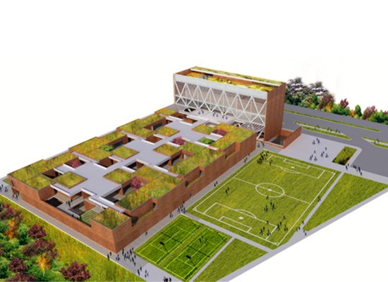 The school design is based on a modular concept that is adjusted according to area and requirement of each site. In addition to conventional learning areas such as classrooms, the building concept also provides spaces for Eco learning as well as Social learning creating an environment that is conducive to enhanced development of students. Each school comprises of a Ground+1 Academic Block and a taller Administrative Block. The Academic Block is designed as a cluster of repeating modules of classrooms that are arranged around courtyards on both ground and upper level. These courtyards are intelligently landscaped to provide opportunities for varied learning. The social interaction spaces along the central corridor increase chances of interaction between different school students. The Administration Block integrates the auditorium, offices, library, gym, indoor swimming pool and terrace sports areas. The building exterior is finished with exposed brickwork, while the interior contrasts with well finished appearance.