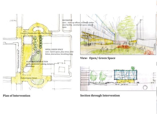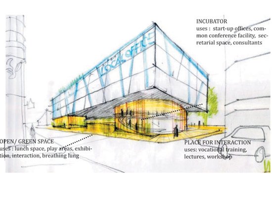 The proposal then suggested making a new intervention which comprised three pronged programmatic: incubator offices, place for interaction and open/ green space. The defunct Alfred Place Street was chosen as the site for this intervention, which was currently used inefficiently as parking or service area, whereas it enjoyed high level of connectivity, prominent location and interesting history, which together provided it potential to play a better role in the city urbanism.
