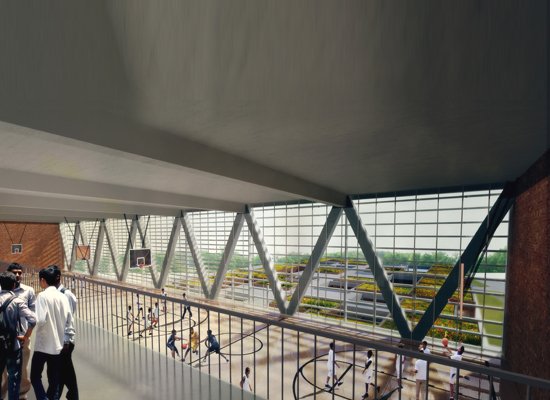 The school design is based on a modular concept that is adjusted according to area and requirement of each site. In addition to conventional learning areas such as classrooms, the building concept also provides spaces for Eco learning as well as Social learning creating an environment that is conducive to enhanced development of students. Each school comprises of a Ground+1 Academic Block and a taller Administrative Block. The Academic Block is designed as a cluster of repeating modules of classrooms that are arranged around courtyards on both ground and upper level. These courtyards are intelligently landscaped to provide opportunities for varied learning. The social interaction spaces along the central corridor increase chances of interaction between different school students. The Administration Block integrates the auditorium, offices, library, gym, indoor swimming pool and terrace sports areas. The building exterior is finished with exposed brickwork, while the interior contrasts with well finished appearance.